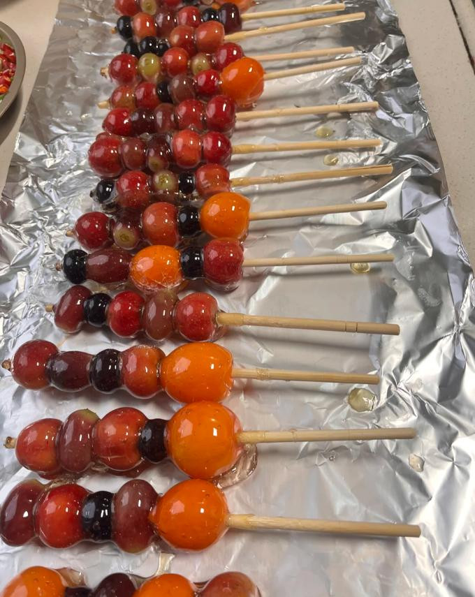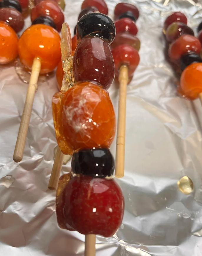 制作糖葫芦的教程似乎也好简便啊:糖和水,按照2:1的比例熬一下,把串好的糖葫芦均匀粘一下,然后放进冷水激一下,拿出来摆放好就不错了。