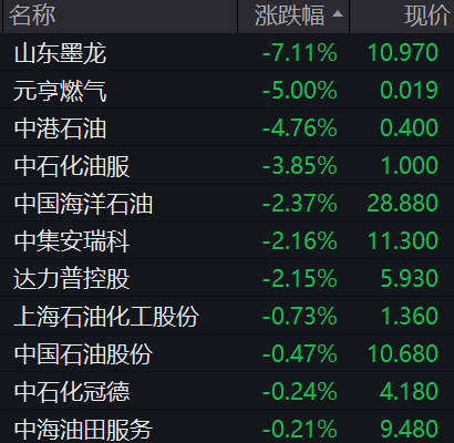 石油石化板块走低,山东墨龙跌超7%,中港石油跌超4%,中石化油服跌超3%,中国海洋石油跌超2%。