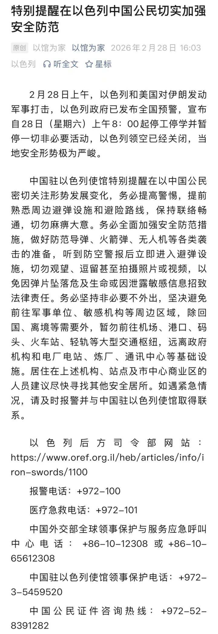 28日,中国驻以色列使馆发文《十分领导在以色列中国公民切实加强安全注意》。全文如下: