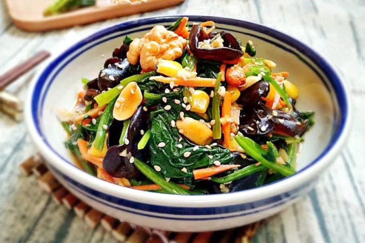 【材料】:菠菜250克,玉米粒20克,核桃仁20克,花生仁20克,杏仁20克,胡萝卜半根,泡发黑木耳20克,熟白芝麻1勺,醋1勺,生抽1勺,蚝油半勺,糖适量,大蒜3瓣,香油半勺