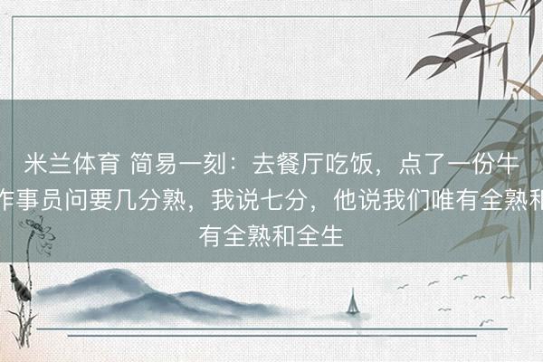 米兰体育 简易一刻:去餐厅吃饭,点了一份牛排,作事员问要几分熟,我说七分,他说我们唯有全熟和全生