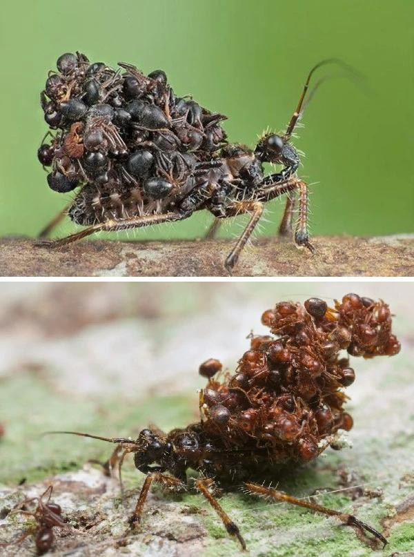 △ 比如上头这个,它学名是Acanthaspis petax,属于猎蝽科(Reduviidae),原产于东非和马来西亚,它们会将吃掉的蚂蚁遗骸贴在我方身上,背着这些遗骸出动,活脱脱等于一个出动得“京不雅”。