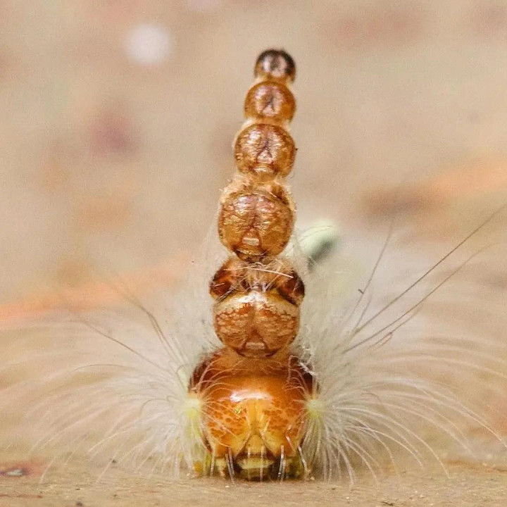 △ 还有这个,它学名是Uraba lugens,亦然一种蛾类,它们会将头部残破像糖葫芦相通串在我方的头上,只不外它的整个头部残破皆是我方的——每次蜕皮背面部残破它皆会黏在头顶。