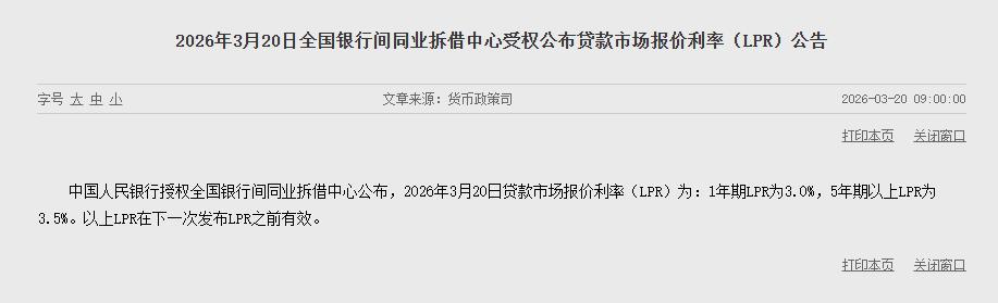 中国3月贷款市集报价利率(LPR)3月20日出炉,1年期和5年期以上LPR均未改造。