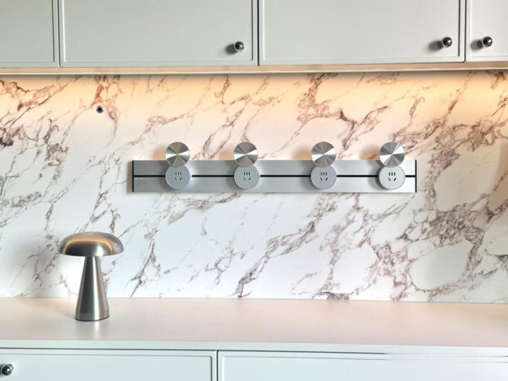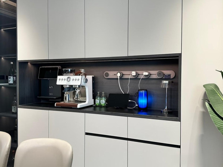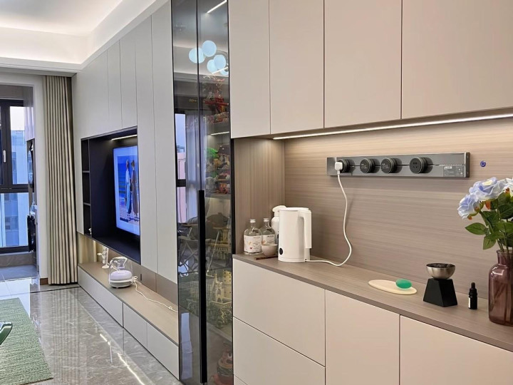 轨谈式插座的当代感也很强,有很高的颜值。像厨房、书斋、电视墙等电器密集区,皆尽头合适。