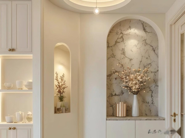 壁龛是在非承重墙上开凿凹槽,或者是在包管谈的时间,作念出凹进去的空间。在这些凹槽的名义,贴瓷砖或者是大理石,形成内置的储物空间。