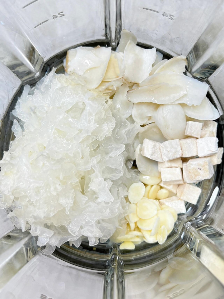 她一边说,一边麻利地取食材:半朵干银耳、一小把百合、二十来粒南杏仁,再加几块茯苓。手脚熟稔得很,一看即是长年作念的。