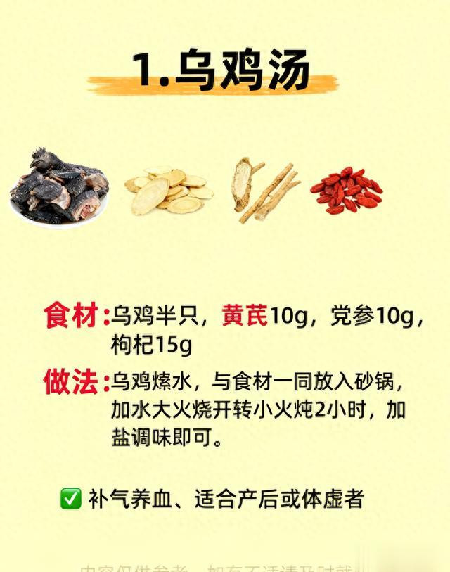 比如黄芪能增强免疫、固表止汗,党参补气提防,当归补血养颜,乌鸡、瘦肉则提供血肉之情,匡助体格接收营养。