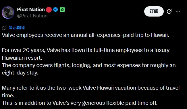 近日,游戏博主@Pirat_Nation发文称,Valve永恒为职工提供一项颇具诱导力的福利——每年一次全额报销的夏威夷豪华度假。