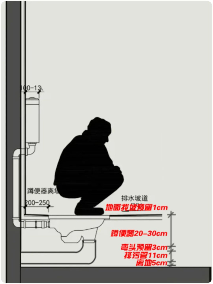 ▲上图为常用蹲便器所需深度,5cm离地+11cm排污管+3cm弯头+20cm蹲便器+1cm大地找坡=至少40cm深度空间,是以蹲便器所需深度还挺多。