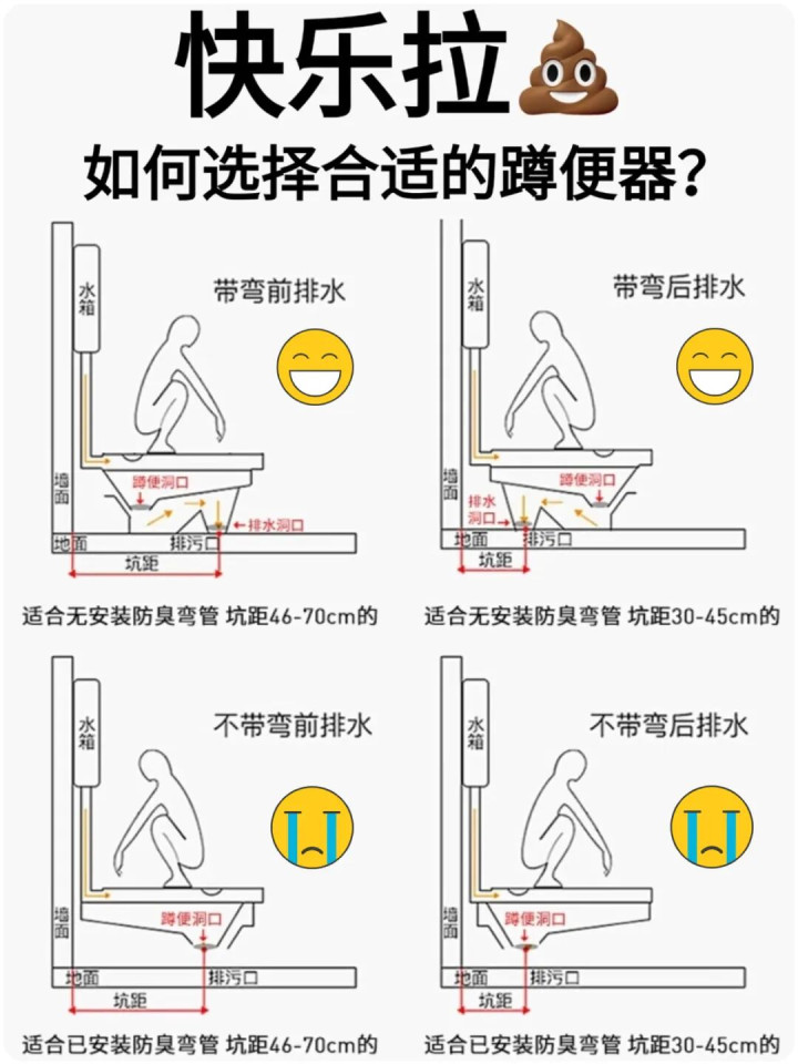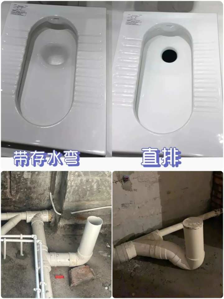 ▲上图所示,带存水弯蹲便器就遴荐不带存水弯排污管;而直排式蹲便器则遴荐带存水弯的排污管;是以自带存水弯的蹲便器+预埋存水弯的情况下,排水慢易堵塞,而纵贯式排水更成功,无窒碍冲力强,省水又释怀!