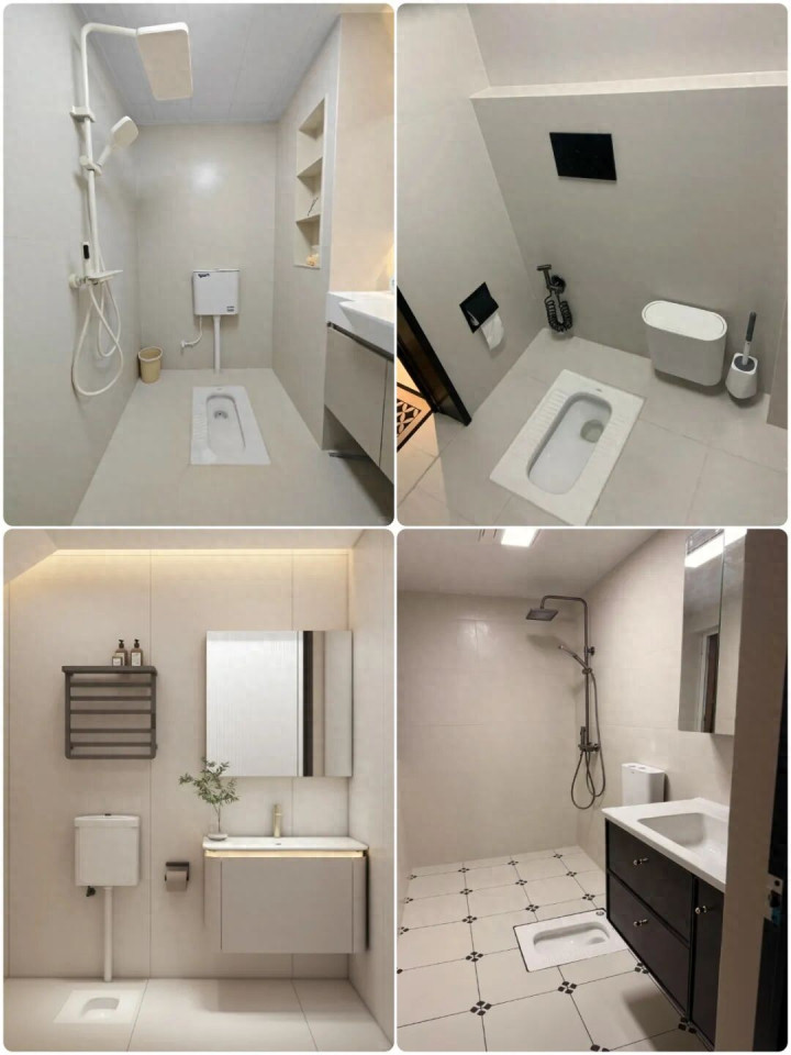 ▲如上图所示,莫得豪阔的空间大地空间,强行作念蹲便器,就必须举高卫生间大地,与淋浴区有个踏步,少则20cm,多则40cm,好意思不雅性与实用性齐打扣头,是否我方可吸收的范围内。