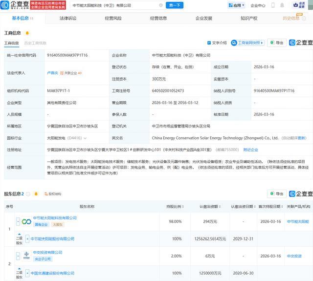 企查查APP知道,近日,中节能太阳能科技(中卫)有限公司开发,米兰体育官网法定代表东谈主为卢喜庆,揣摸打算限制包含:发电时期办事;太阳能发电时期办事;储能时期办事;光伏拓荒及元器件销售;光伏发电拓荒租借等。企查查股权穿表现出,该公司由太阳能(000591.SZ)全资子公司中节能太阳能科技有限公司、中邦交建(601800.SH)全资子公司中交投资有限公司共同捏股。