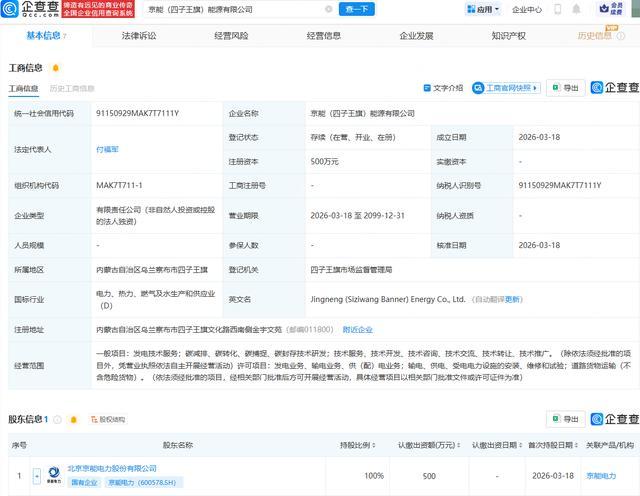企查查APP表示,近日,京能(四子王旗)动力有限公司拓荒,MILAN SPORTS法定代表东谈主为付福军,决策范围包含:发电技巧奇迹;发电业务、输电业务、供(配)电业务;输电、供电、受电电力步调的装配、维修和教育等。企查查股权穿透表示,该公司由京能电力(600578.SH)全资捏股。