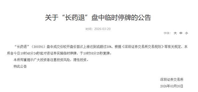 米兰体育官网 深交所发布对于“长药退”盘中临时停牌的公告